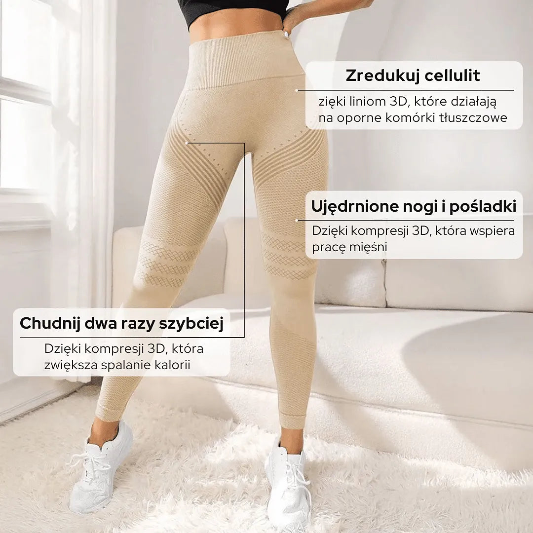 Kompresja 3D tworzy naturalny opór, który aktywuje mięśnie przy każdym ruchu. To pobudza krążenie, poprawia jędrność nóg i wspiera redukcję cellulitu.